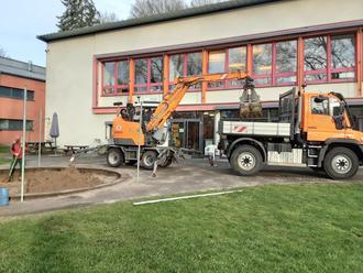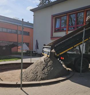 Begeistert konnten die Kinder vom Fenster aus beobachten, wie der Bagger Schaufel für Schaufel alten Sand aus den Sandkästen entfernt und auf die Ladefläche des Unimogs geladen hat.