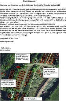 Gemäß § 8 Abs. (1) der Satzung für die Friedhöfe der Gemeinde Marpingen vom 06.01.2007 in der zurzeit geltenden Fassung beträgt die Ruhezeit für Grabstätten für Erwachsene mindestens 25 Jahre. Der Ortsrat hat in seiner Sitzung am 09.02.2024 und der Gemeinderat am 28.02.2024 der Einebnung von Grabstätten ab Mai 2024 zugestimmt.