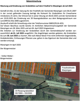 Die Arbeiten zur Einebnung der Grabstätten durch den Gemeindebauhof werden vor-aussichtlich ab 01. Juli 2025 ausgeführt. Die Angehörigen werden gebeten, die Grabstellen bis zum 30. Juni 2025 zu räumen. Alle nach Ablauf dieser Frist nicht entfernten Gegenstände, Grabdenkmäler, Einfassungen Pflanzen usw. gehen in das Eigentum der Gemeinde über und werden entsorgt.
