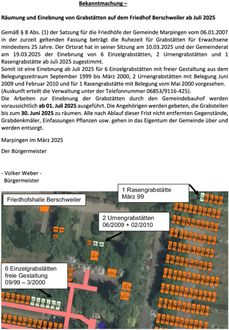 Gemäß § 8 Abs. (1) der Satzung für die Friedhöfe der Gemeinde Marpingen vom 06.01.2007 in der zurzeit geltenden Fassung beträgt die Ruhezeit für Grabstätten für Erwachsene mindestens 25 Jahre. Der Ortsrat hat in seiner Sitzung am 10.03.2025 und der Gemeinderat am 19.03.2025 der Einebnung von 6 Einzelgrabstätten, 2 Urnengrabstätten und 1 Rasengrabstätte ab Juli 2025 zugestimmt.
