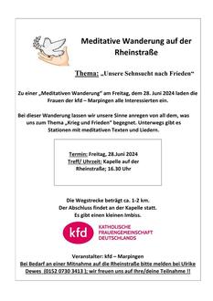 Jugendherberge Tholey – Frühstück, inklusive, Weiterfahrt Wallfahrt nach Stockstadt. Messe in Stockstadt Maria Königin des Friedens. Bad Dürkheim Wurstmarkt. Abschluss Römerkastel Habenichts. Teilnehmerbeitrag pro Person 40 € inkl. Frühstück und Trinkgelder. Anmeldungen und Zahlung im Pfarrbüro, zu den bekannten Öffnungszeiten. Bitte bis 01.08.2024 erledigen. Telefon 06853 2144, bzw. marpingen@pg-marpingen.de
