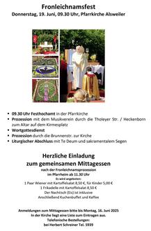 Im Anschluss an das Festamt und die Prozession zu Fronleichnam, am Sonntag, 22.06.2025, findet auch in diesem Jahr wieder das traditionelle Pfarrwiesenfest statt, zu dessen Gelingen wieder viele Helfer*innen, aber auch viele Kuchenspenden benötigt werden. Wir freuen uns sehr, wenn sich viele Kuchenbäcker*innen auf unserer Liste, die in der Pfarrkirche ausliegt, eintragen und einen Kuchen backen.