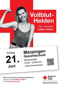 Kalendertäglich werden in Deutschland rund 15.000 Blutspenden benötigt, um die Patientinnen und Patienten in den Kliniken, Krankenhäusern und Arztpraxen zu versorgen. Der Blutspendedienst des Deutschen Roten Kreuzes ist daher dringend auf die Unterstützung der Bevölkerung durch Blutspenden angewiesen. Das Deutsche Rote Kreuz Marpingen ruft daher am Freitag den 21. Juni 2024 zur Blutspende auf, von 16:30 Uhr bis 20:00 Uhr in der Gemeinschaftsschule Marpingen.