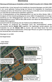 Die Arbeiten zur Einebnung der Grabstätten durch den Gemeindebauhof werden voraussichtlich ab 15. Oktober 2025 ausgeführt. Die Angehörigen werden gebeten, die Grabstellen bis zum 14. Oktober 2025 zu räumen. Alle nach Ablauf dieser Frist nicht entfernten Gegenstände, Grabdenkmäler, Einfassungen Pflanzen usw. gehen in das Eigentum der Gemeinde über und werden entsorgt.
