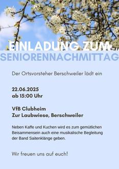 Auch am Sonntag stellt der VFB wieder das Clubheim wieder zum Wohle des Dorfes zur Verfügung. Dann findet dort der Seniorennachmittag statt, bei dem unsere älteren Mitbürger ganz herzlich dazu eingeladen sind, bei Kaffee und Kuchen ein paar gemütlichen Stunden mit schönen Gesprächen zu verbringen. Musikalisch umrahmt wird die Veranstaltung durch die Band Saitenklänge aus Dirmingen.
