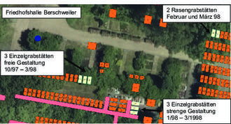 Somit ist eine Einebnung ab Juli 2023 für 3 Einzelgrabstätten mit strenger Gestaltung und 3 Einzelgrabstätten freier Gestaltung aus dem Belegungszeitraum Oktober 1997 bis März 1998 und für 2 Rasengrabstätten aus dem Belegungszeitraum Februar und März 1998 vorgesehen.