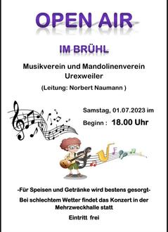 Am Samstagabend um 18 Uhr findet eine weitere, sehr interessante Veranstaltung statt. Unser Musikverein und unser Mandolinenverein Urexweiler laden zu einem gemeinsamen Openair-Konzert in den Brühl ein. Sollte das Wetter wider Erwarten nicht passen, findet die Veranstaltung in der Mehrzweckhalle statt.