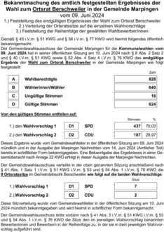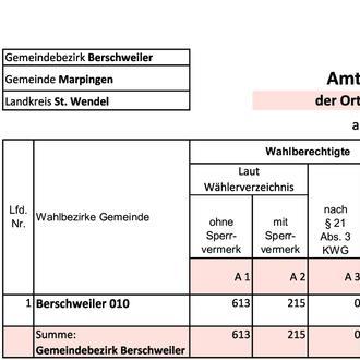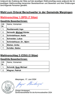 Wichtige Bekanntmachungen zu den Kommunalwahlen 2024, hier: Ortsratswahlen in der Gemeinde Marpingen (Gemeindebezirk Berschweiler)
