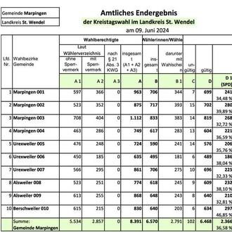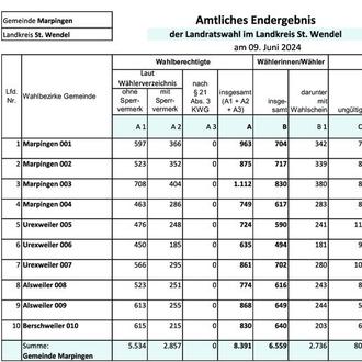 Wichtige Bekanntmachungen zu den Kommunalwahlen 2024, hier: Landratswahl und Kreistagswahl in der Gemeinde Marpingen