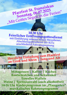 Unser diesjähriges Pfarrfest findet am Sonntag, 06.07.2025 statt. Wir beginnen mit der Heiligen Messe um 10:30 Uhr, die auch gleichzeitig Abschlussgottesdienst der KiTa ist, unsere neuen Messdiener werden eingeführt und nach der Messe werden noch die Fahrzeuge gesegnet. Im Anschluss gibt es Frühschoppen, Mittagessen (Lyonerpfanne), Kaffee und Kuchen sowie die traditionellen Exweller Waffeln. Für kühle Getränke, eine Wein- und Spritzauswahl ist bestens gesorgt. Am Nachmittag gibt es ein musikalisches Rahmenprogramm und auch an die Kinder wurde gedacht: Die großen Messdiener werden mit Unterstützung des KVU im „Pfarrgarten“ ein Kinderprogramm von 14:00 - 16:00 Uhr bieten und es gibt einen Cocktail extra für Kinder!