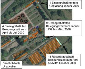 Für 13 Rasengrabstätten aus dem Belegungszeitraum von April bis Mitte Oktober 2000, 1 Einzelgrab mit freier Gestaltung vom Januar 2000, 4 Einzelgrabstätte mit strenger Gestaltung aus dem Belegungszeitraum April bis Juli 2000 und 9 Urnengrabstätten mit Belegungszeitraum Januar 1999 bis März 2006 werden nach Ablauf der Mindestruhezeit im Oktober 2025 eingeebnet.