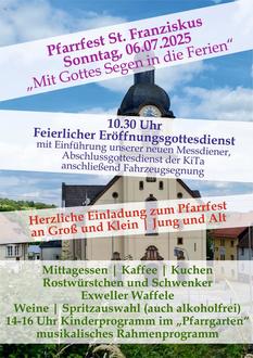 Am kommenden Sonntag feiern wir unter dem Motto „Mit Gottes Segen in die Ferien“ unser diesjähriges Pfarrfest. Los geht’s um 10:30 Uhr mit einem feierlichen Gottesdienst mit Einführung der neuen Messdiener sowie einem Abschlussgottesdienst unserer KiTa-Kinder.
