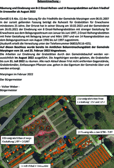Gemäß § 8 Abs. (1) der Satzung für die Friedhöfe der Gemeinde Marpingen vom 06.01.2007 in der zurzeit geltenden Fassung beträgt die Ruhezeit für Grabstätten für Erwachsene mindestens 25 Jahre. Der Ortsrat hat in seiner Sitzung am 10.02.2022 und der Gemeinderat am 26.01.2022 der Einebnung von 8 Einzel-Reihengrabstätten mit strenger Gestaltung für Erwachsene aus dem Belegungszeitraum von Januar bis Juni 1997, 2 Einzel-Reihengrabstätten mit freier Gestaltung mit Belegung Januar un März 1997 und von 14 Rasengrabstätten aus dem Belegungszeitraum von August 1996 bis Juli 1997 zugestimmt.