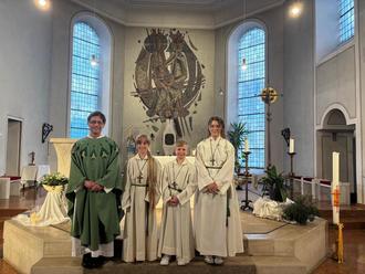 Am letzten Samstag durften wir Greta Rauber und Elias Mainzer als neue Messdiener offiziell in der Liturgie willkommen heißen. Darüber freuen wir uns sehr und wünschen ihnen viel Freude bei ihrem Dienst und eine schöne Zeit bei den Messdienern. Herzlichen Dank an Emma Brill, die die beiden gemeinsam mit Pfr. Breininger auf ihren Dienst vorbereitet hat sowie auch an alle anderen Messdiener für Ihr Engagement.