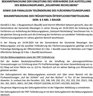 Bekanntmachung der Einleitung des Verfahrens zur Aufstellung des Bebauungsplanes „Solarpark Rechelsberg“