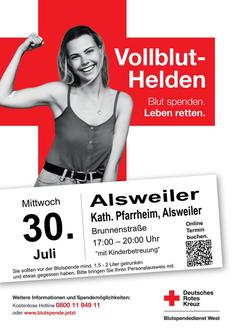 Die nächste Blutspende im Pfarrheim in Alsweiler findet am Mittwoch, dem 30.07.2025, wie gewohnt von 17:00 Uhr bis 20:00 Uhr statt.