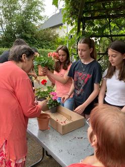 Der Besuch fand im Rahmen eines Projekttages zum Thema „Respekt“ statt. Respekt sollte an diesem Tag aber nicht nur ein Wort bleiben. Die Jugendlichen stellten ein abwechslungsreiches Programm auf, um den Bewohnerinnen und Bewohnern des Wohnheimes etwas Gutes zu tun. Sie backten vor ihrem Besuch Muffins, kochten Milchreis, kauften Blumen und Obst. Und dann ging es los. Gemeinsam mit Bewohnern bereiteten die Jungen und Mädchen einen Obstsalat zu, und servierten diesen zusammen mit den mitgebrachten Leckereien. In einer gemütlichen Runde im Schatten von Weinreben lasen die Schülerinnen und Schüler das Buch „Blumen im Kopf“ von Lisa Wirth vor. Anschließend pflanzten sie gemeinsam mit den Bewohnerinnen und Bewohnern Blumen, die sie als kleine Erinnerung an den schönen Vormittag an diese verschenkten.