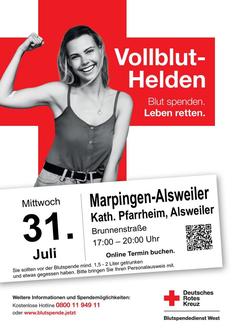 Also kommt vorbei und spendet Blut. Am 31.07. von 17 Uhr bis 20 Uhr im Pfarrheim Alsweiler. Wie gewohnt mit Verpflegung und Kinderbetreuung durch das Jugendrotkreuz.