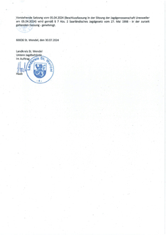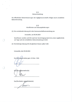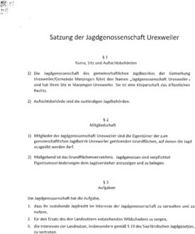 Die nachfolgende Satzung der Jagdgenossenschaft Urexweiler wurde in der Jahreshauptversammlung am 05. April 2024 beschlossen und tritt am Tag nach der Veröffentlichung und somit am 03. August 2024 in Kraft.