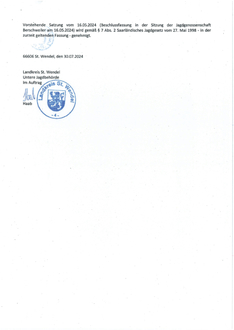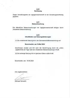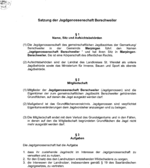 Die nachfolgende Satzung der Jagdgenossenschaft Berschweiler wurde in der Jahreshauptversammlung am 16. Mai 2024 beschlossen und tritt am Tag nach der Veröffentlichung und somit am 03. August 2024 in Kraft.
