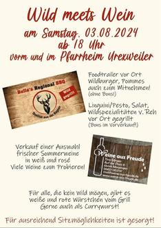 Am morgigen Samstag findet das diesjährige „Wild meets Wein“ statt, zudem Bulle’s Regional BBQ und unserer örtlicher Weinhandel „Weine aus Freude“ die Bevölkerung recht herzlich einladen. Leckere Wildburger und Wildspezialitäten (auf Vorbestellung) werden neben einer Auswahl an Sommerweinen angeboten. Los geht es ab 18 Uhr vorm und im Pfarrheim Urexweiler.
