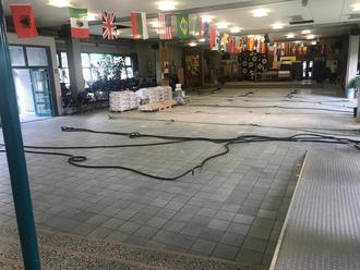 Die Aula in der Gesamtschule kann leider nicht genutzt werden. An Pfingsten hat das Hochwasser 20 cm in der Aula gestanden. Der Schaden, den das Wasser verursachte ist immer noch nicht ganz behoben. Es laufen zur Zeit immer noch Trocknungsarbeiten.