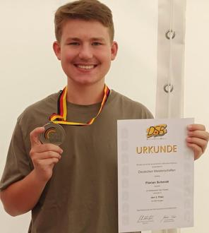 Wieder mal kann ich voller Freude eine sportliche Höchstleistung vermelden. Florian Schmidt erreichte bei der deutschen Meisterschaft mit 490 Ringen in der Kategorie 50-Meter-Pistole bei den Junioren einen herausragenden zweiten Platz!