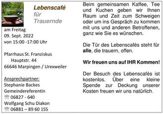 In dringenden Fällen wenden Sie sich bitte an das Pfarrbüro Marpingen, T: 06853-2144 oder an das Pfarrbüro Alsweiler, T: 06853-922314.