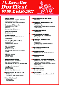 „Machen Sie sich ein schönes Wochenende auf dem “Exweller Dorffest”, lassen Sie daheim die Küche kalt, genießen sie das reichhaltige Angebot an Speisen und Getränken und unterstützen Sie so das große Engagement der Urexweiler Vereine“, sagt Bürgermeister Volker Weber.