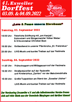Für die vielen erwarteten Gäste haben die Urexweiler Vereine, ein pralles Programm auf die Beine gestellt. Bei der diesjährigen Ausgabe steht das Traditionsfest unter dem Motto „Exweller Dorffest: Love & Peace unnerm Bierebaam“ um damit auch ein Zeichen für den Frieden in Europa und der Welt zu setzen! Die ganze Festmeile durch den Ortskern von Urexweiler wird von den Ständen der 21 teilnehmenden Vereine mit ganz viel Liebe geschmückt.