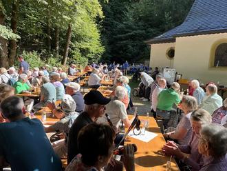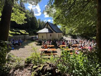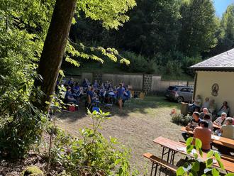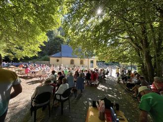 Bei angenehmem Sommerwetter machten sich zahlreiche Besucher auf den Weg zum Härtelwald. Zu Fuß, mit dem Auto oder dem eingerichteten Shuttleservice fanden über 200 Gäste den Weg zum Platz rund um die Kapelle. Bis fast auf den letzten Stuhl besetzt, lauschte die Menge dem Konzert der Musikgemeinschaft Alsweiler-Marpingen unter der Leitung von Sabrina Werth, die über eine Stunde für gute Stimmung sorgte.