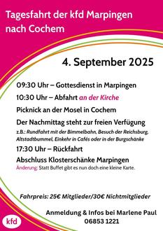 | MARP | 09:30 | Hl. Messe mitgestaltet von der kfd, anschl. Tagesfahrt nach Cochem |