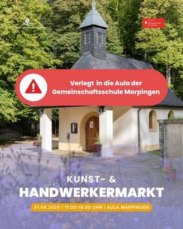 Aufgrund der schlechten Wetterprognose für Sonntag, den 31. August 2025, wird der Kunst- und Handwerkermarkt in die Aula der Gemeinschaftsschule Marpingen verlegt. Die Messe anlässlich Mariä Geburt findet um 10.30 Uhr in der Pfarrkirche in Marpingen statt.