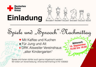 Am Mittwoch, den 14.09., findet der nächste Spielenachmittag von 15 Uhr bis ca. 18 Uhr im Vereinshaus Alsweiler statt. Es gibt wie immer verschiedenste Gesellschaftsspiele zur Auswahl, die man gemeinsam bei Kaffe und Kuchen spielen kann.