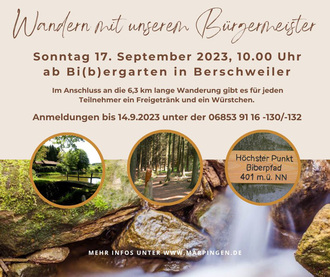 Um besser planen zu können bitten wir um Anmeldungen bis 14.09.2023 bei der Stabsstelle für Öffentlichkeitsarbeit, Kultur und Tourismus unter der Telefonnummer 06853 91 16 -130 oder -132 oder per Mail an Gemeindeverwaltung@marpingen.de