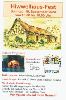 Am Sonntag, den 10. September 2023, findet von 13:00 Uhr bis 18:00 Uhr das Hiwwelhaus-Fest statt. Es wird wieder ein schönes Programm geboten werden und für das leibliche Wohl ist bestens gesorgt.