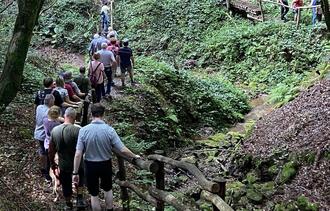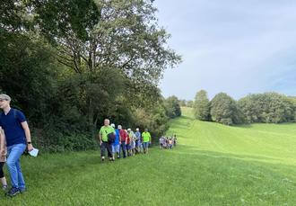 Am gestrigen Sonntag, dem 17.09.2023, lud Bürgermeister Volker Weber zur Wanderung nach Berschweiler ein. Rund 60 Bürgerinnen und Bürger von jung bis alt und auch mancher Vierbeiner folgten seiner Einladung und so traf man sich bei bestem Wetter und gut gelaunt am Ausgangspunkt, dem Bi(b)ergarten in Berschweiler im Engstereck. Nach der Begrüßung machte man sich um kurz nach zehn auf in Richtung Schachenwälder. Dort ging es weiter auf unseren Premium-Wanderweg, den Biberpfad, der vor Kurzem erneut durch das deutsche Wanderinstitut zertifiziert wurde, und es musste auch schon gleich der erste Anstieg gemeistert werden. Die Mühe wurde jedoch mit einem fantastischen Ausblick über drei Gemeinden belohnt. Weiter ging es über das offene Feld und vorbei an den Windrädern nahe der „Hoch Stroß“ zwischen Dirmingen und Tholey. Auf halber Strecke gab es dann eine kleine Überraschung für die Wanderer, denn dort warteten leckere gekühlte Getränke, die mit Freude angenommen wurden. Während der Rast wurde „gesproocht“ und gelacht, der Bürgermeister bedankte sich nochmals bei allen Teilnehmerinnen und Teilnehmern fürs Mitwandern sowie bei der Stabstelle der Gemeinde für die Organisation, und auch das ein oder andere Likörchen fand einen frohen Abnehmer. Natürlich durfte bei dieser Gelegenheit ein schönes Gruppenfoto nicht fehlen. Nachdem sich alle gestärkt hatten, ging es durch die Schlucht am Lochwiesbach, einem sehr schönen Abschnitt des Biberpfades, und weiter durch Wälder und über Felder, vorbei am alten Sportplatz am Strengenberg und zurück in den Bi(b)ergarten. Dort hatten Christine und ihr Team bereits die Rostwürstchen auf den Grill liegen und die Getränke gekühlt, um die hungrigen und durstigen Wanderer zu versorgen. Bürgermeister Volker Weber und das Team der Gemeinde Marpingen bedankt sich nochmal ganz herzlich bei allen, die mitgewandert sind und zum Erfolg der Tour beigetragen haben - wir freuen uns schon auf die nächste Wanderung.
