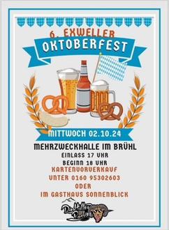 Der Oktober steht vor der Tür und jeder weiß, was das bedeutet: Bereits zum 6. Mal findet am 2. Oktober das Exweller Oktoberfest statt. Wie im vergangenen Jahr wird unsere Mehrzweckhalle auch in diesem Jahr wieder zum Festzelt umfunktioniert. Los geht es um 18 Uhr mit dem offziellen Fassanstich. Im Anschluss heizen Euch „Die Hüttenrocker“ wieder ordentlich ein. Ich freue mich, wenn es wieder heißt: „O’zapft is!“