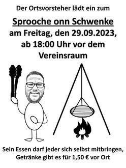 Gerne weise ich noch mal auf das heutige, an diesem Freitag stattfindende „Sprooche onn Schwenke“ hin. In einer lockeren Atmosphäre wollen wir die Gelegenheit nutzen, uns über die täglichen und vielleicht auch nicht alltäglichen Dinge in unserem Dorf zu unterhalten und auszutauschen. Ich würde mich freuen, wieder zahlreiche Besucherinnen und Besucher heute Abend vor dem Vereinsraum begrüßen zu dürfen.