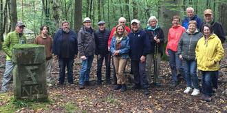 Die Wanderer verweilen bei dem Dreibannstein zwischen Marpingen, Urexweiler und Berschweiler im Kaiserwald (Foto: Besse).