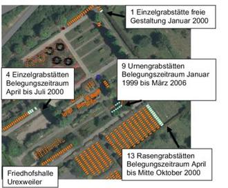 Für 13 Rasengrabstätten aus dem Belegungszeitraum von April bis Mitte Oktober 2000, 1 Einzelgrab mit freier Gestaltung vom Januar 2000, 4 Einzelgrabstätte mit strenger Gestaltung aus dem Belegungszeitraum April bis Juli 2000 und 9 Urnengrabstätten mit Belegungszeitraum Januar 1999 bis März 2006 werden nach Ablauf der Mindestruhezeit im Oktober 2025 eingeebnet.