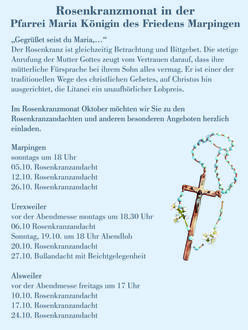 Im Rosenkranzmonat Oktober möchten wir Sie zu den Rosenkranzandachten und anderen besonderen Angeboten herzlich einladen.