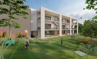 Die Lage des neuen Traktes ist so gewählt, dass möglichst wenig Fläche von der Außenanlage verloren geht und eine Trennung zwischen Parkplatz und Außenbereich erfolgt. Alle drei Etagen sind vollständig über dem Erdreich errichtet und somit optimal belichtet. Die überdachten Balkone auf jeder Etage dienen als Fluchtweg und sollen eine bessere Verbindung zwischen den Gruppenräumen und dem Speisesaal sowie Innen und Außen gewährleisten.