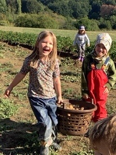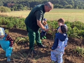 Karl-Josef und Franz-Josef begrüßten uns am Kartoffelfeld. Karl-Josef zeigte den Kindern, wie die Kartoffeln früher von Hand geerntet wurden. Anschließend fuhr er mit dem Traktor übers Feld und wir konnten sehen, wie viel schneller und leichter die Arbeit mit dem Traktor geht. Anschließend durften die Kinder endlich starten. Alle liefen los, um möglichst viele Kartoffeln zu finden. In Windeseile waren die Körbe gefüllt und wir hatten uns ein gemütliches Frühstück verdient.