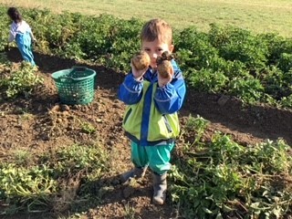 Am 12. September starteten schon früh morgens alle Kinder der Koalabären und der Drachenbande mit einem Fußmarsch zum Kartoffelfeld. Bepackt mit Rucksäcken, ausgestattet mit Matschkleidern und voller Vorfreude auf die Kartoffelernte bezwangen wir die steilen Hügel und durchquerten die Felder bis wir am Ziel waren.