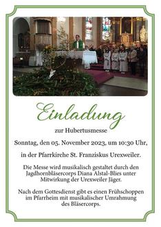 | UREX | 10:30 | Hochamt: Hubertusmesse, musik. mitgest. v. Jagdhornbläsercorps Diana Alstal-Blies; Mitwirkung d. Urexweiler Jäger |