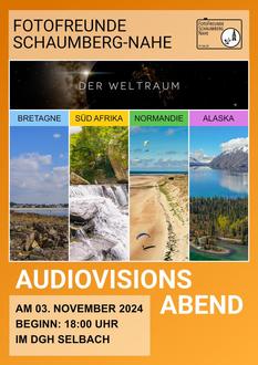 Die „Fotofreunde Schaumberg-Nahe“ laden auch in diesem Jahr wieder zu einem Audiovisionsabend im Dorfgemeinschaftshaus in Selbach ein. Wir nehmen Sie mit zu einer "Reise ins Weltall" und zeigen Ihnen Beiträge zu Reisen in die Bretagne, Südafrika, Normandie und Alaska.