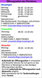 Die Öffnungszeiten unserer Pfarrbüros sind nun wie folgt: