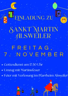17:30 Uhr Gottesdienst in der Pfarrkirche St. Mauritius Alsweiler, Anschließend traditioneller Laternenumzug zum Kirmesplatz mit entsprechendem Martinsfeuer, Verlosung der Preise im Pfarrheim Alsweiler