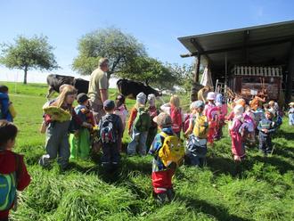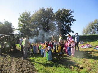 Danach wuschen die Kinder mit großer Begeisterung die Kartoffeln um sie anschließend in ein Feuer zu werfen. Während die Kartoffeln in der Glut gar wurden, vertrieben wir uns die Zeit, indem wir Verstecken im Sonnenblumenfeld spielten, probierten die reifen Sonnenblumenkerne und kletterten in den Traktor, um dort auf dem Fahrersitz zu spielen. Zu Mittag aßen wir die Kartoffeln aus dem Feuer, die sehr lecker schmeckten, und unser mitgebrachtes Mittagessen aus Gurken, Paprika, Tomaten, Käse und Wurst, Weck, und anschließend gab es noch Donuts als Nachtisch. Die Zeit verging viel zu schnell und wir wollten gar nicht zurück, so gemütlich und spannend war es auf dem Kartoffelacker von Opa Karli. Auf dem Rückweg konnten wir bei Opa Karlis Rhönschafen und Kühen vorbeischauen. Lui nahm ein kleines Lämmchen auf den Arm und jeder durfte es streicheln. Es war sehr schön. Aber nur für uns, das Lämmchen wollte nur zu seiner Mama, es war ja erst drei Wochen alt.